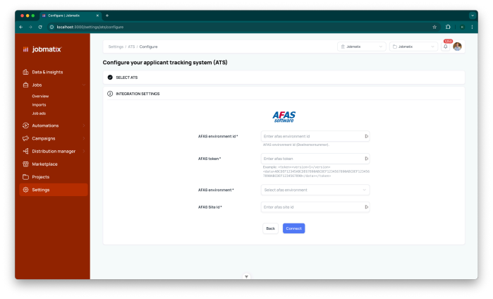 Deze handleiding helpt je bij het opzetten van een verbinding tussen Jobmatix en AFAS. Zodra de koppeling actief is, worden Easy Apply-sollicitanten vanuit Jobmatix direct gesynchroniseerd met jouw AFAS-systeem.