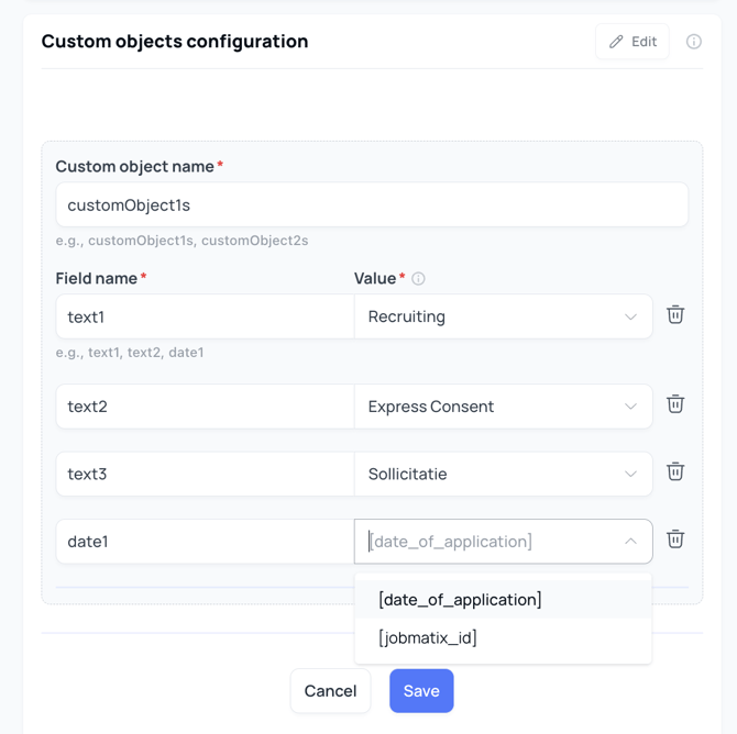 - Custom object name: Voer hier de exacte API-naam van het object in zoals geconfigureerd in Bullhorn (bijv. customObject1s of customObject2s).