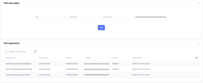 Voordat je de koppeling volledig in gebruik neemt, raden we aan om een Test Easy Apply uit te voeren. Hiermee simuleer je een echte sollicitatie zonder dat je een externe vacaturesite hoeft te gebruiken.