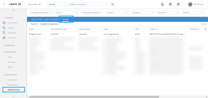 Log in bij Carerix met een account met beheerdersrechten. Navigeer naar Onderhoud (Maintenance) -> Identity access menu. Dit bevindt zich in het linkermenu. Ga daarheen en selecteer de tab Clients.