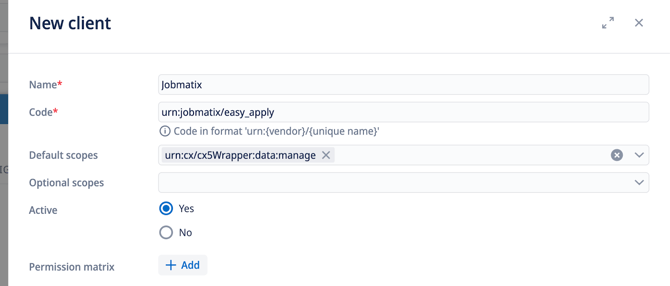 Naam (Name): Geef je client een duidelijke naam (bijv. "Jobmatix Integratie"). Dit helpt je om deze later te identificeren.