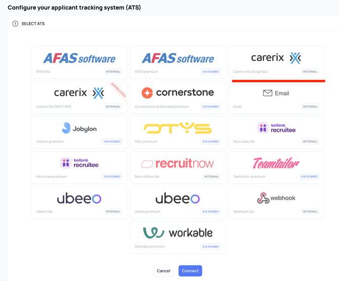 Verschijnt de Carerix-integratie in je lijst met verbonden ATS-systemen.