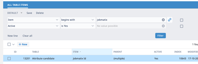 Zoek in het Tabellen-overzicht naar Attribute candidate (Attribuut kandidaat) en klik erop. Druk vervolgens op de knop + Nieuw (+ New) om een nieuw attribuut aan te maken.