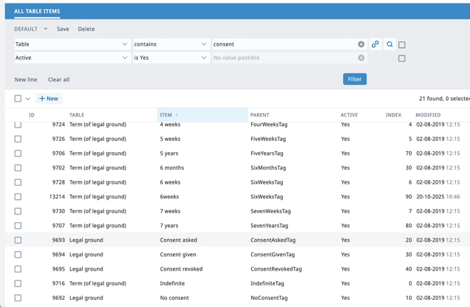 Zoek nu naar items waar de kolom TABEL de waarde Termijn (van wettelijke grondslag) toont. Veelvoorkomende opties zijn: Kies de toestemmingstermijn die overeenkomt met het data retentiebeleid van jouw organisatie. Noteer het ID-nummer uit de ID-kolom.