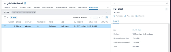 In het tabblad Publicaties ziet u een lijst met alle publicaties voor deze vacature. Elke publicatie heeft: