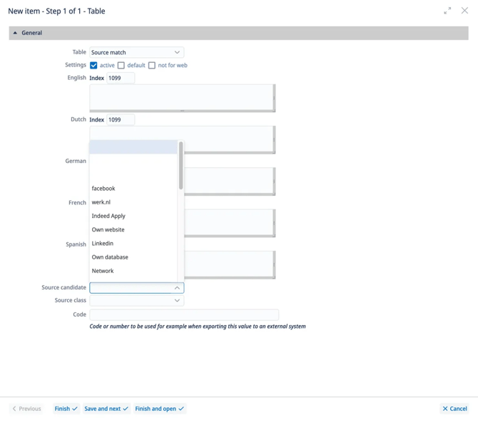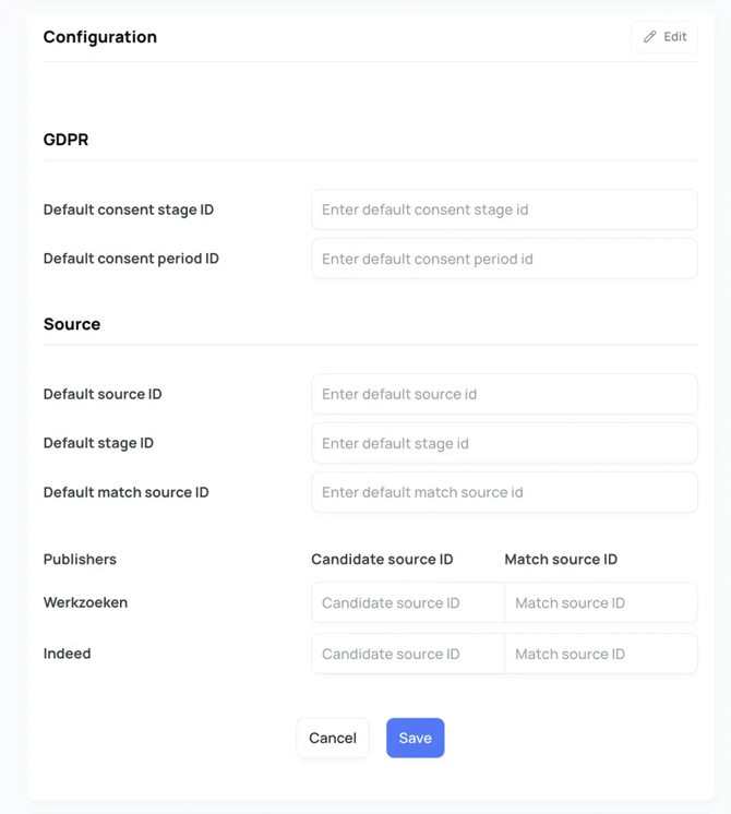 💡 Voorbeeldconfiguratie: Indeed → Kandidaat bron-ID: 11093 (Indeed Apply), Match bron-ID: 11096 (Indeed Apply) Werkzoeken → Laat leeg om standaarden te gebruiken Jobg8 → Kandidaat bron-ID: [uw aangepaste ID], Match bron-ID: [uw aangepaste ID]