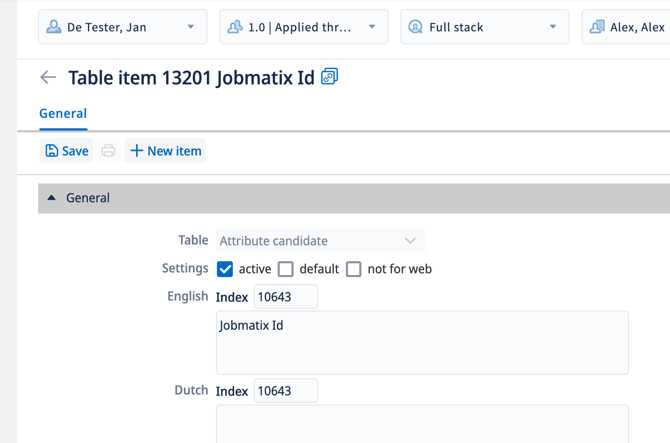 - Elke kandidaat in Carerix ontvangt automatisch een uniek Jobmatix ID op de tab Algemeen (General) onder Extra informatie (Additional information).
